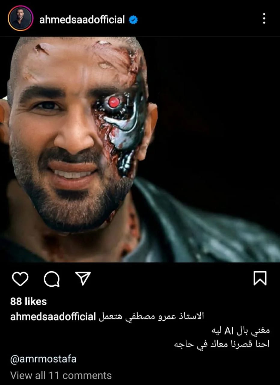 وكان أحمد سعد، وجه رسالة لـ عمرو مصطفى، عبر حسابه الرسمي بموقع إنستجرام، عقب إعلان الأخير عن مشروع تقديم أول مطرب باستخدام الذكاء الاصطناعي، حيث نشر صورة له بنصف رأس إنسان آلي.