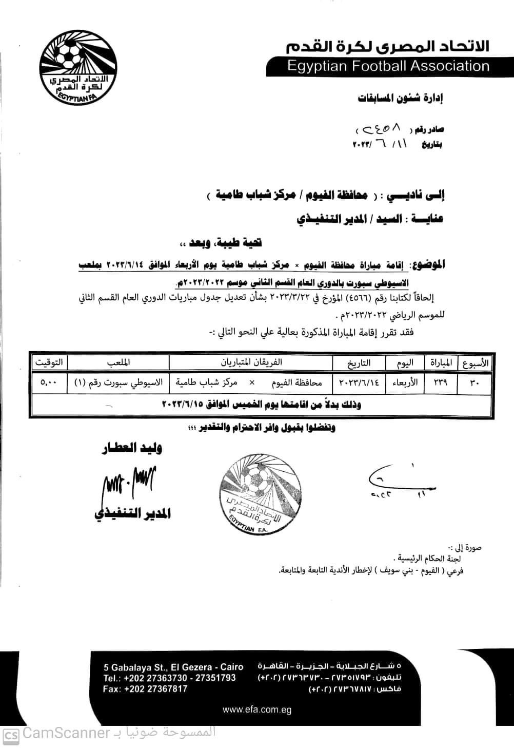 وتقام المباراة بين فريقي الفيوم ومركز شباب طامية يوم الأربعاء 14 يونيو، بدلًا من إقامتها يوم الخميس 15 يونيو، على ملعب الأسيوطي سبورت في تمام الساعة الخامسة عصرًا.
