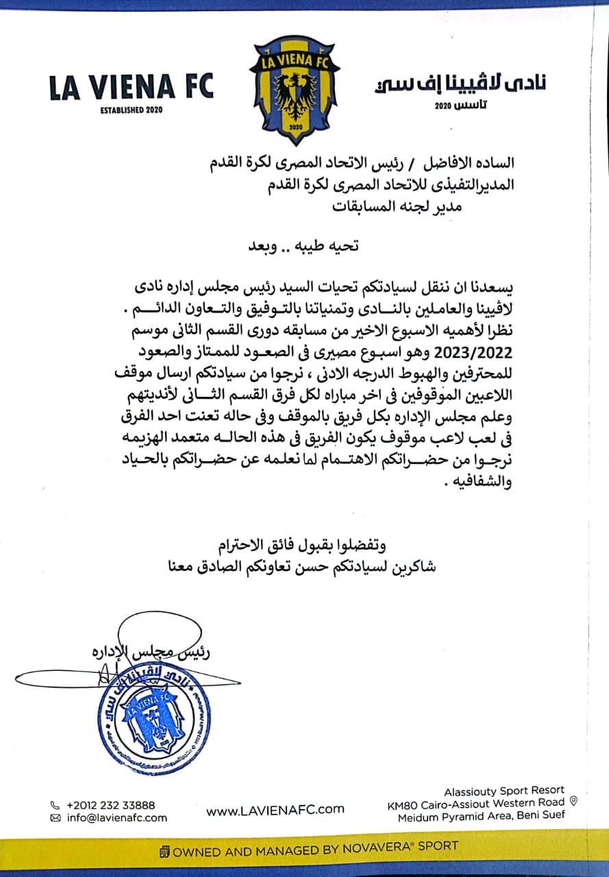 الدرجة الثانية.. لافيينا يخاطب اتحاد الكرة قبل نهاية الدوري لهذا السبب