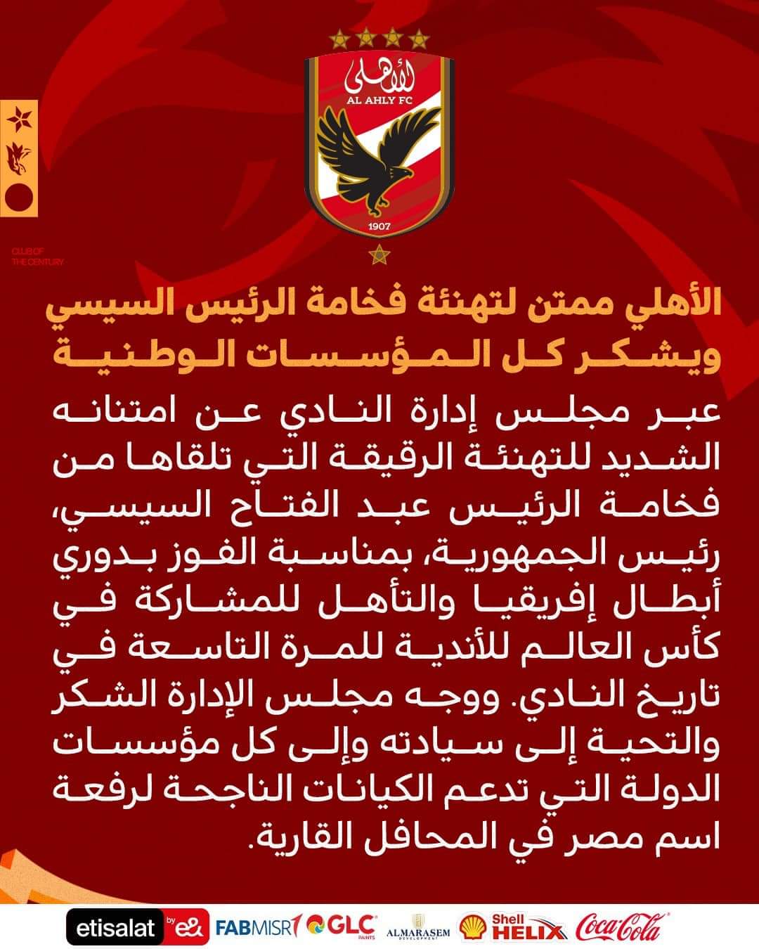 ووجه مجلس إدارة النادي الأهلي الشكر والتحية إلى الرئيس السيسي وإلى كل مؤسسات الدولة التي تدعم الكيانات الناجحة لرفعة اسم مصر في المحافل القارية.