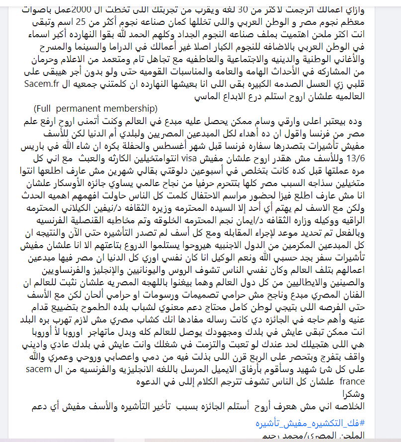 واختتم محمد رحيم حديثه، قائلًا: وكان نفسي الناس تشوف الروس واليونانيين والإنجليز والفرنساويين والصينين والايطاليين من كل دول العالم وهما بيغنوا باللهجه المصريه علشان نثبت للعالم إن الفنان المصري مبدع وناجح مش حرامي تصميمات ورسومات أو حرامي ألحان لكن مع الأسف حتى الفرصة اللى بتيجي لوطن كامل محتاج دعم معنوي لشباب بلده الطموح بتضييع قدام عنيه وأهم حاجة في الجائزه دي كانت رسالة مفادها إنك كشاب مصري مش لازم تهرب بره البلد أنت ممكن تبقى عايش في بلدك ومجهودك يوصل للعالم كله وبدل ما تهاجر أوروبا لأ أوروبا هي اللي هتجيلك لحد عندك لو تعبت والتزمت في شغلك وأنت عايش في بلدك عادي واديني واقف بتفرج وبتحصر على الربع قرن اللي بذلت فيه من دمي وأعصابي وروحي وعمري والله على كل شيء شهيد وسأقوم بإرفاق الايميل المرسل باللغه الإنجليزية والفرنسية من الـ sacem france علشان كل الناس تشوف تترجم الكلام اللي في الدعوة، وشكرا، الخلاصة إني مش هعرف أروح استلم الجائزه بسبب تأخير التأشيرة وللأسف مفيش أي دعم.