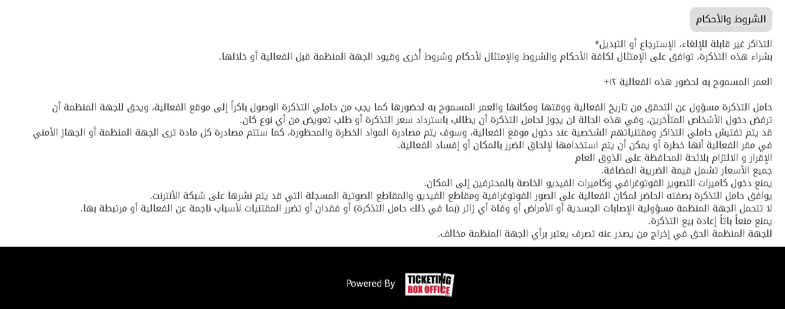 - لا تتحمل الجهة المنظمة مسؤولية الإصابات الجسدية أو الأمراض أو وفاة أي زائر (بما في ذلك حامل التذكرة) أو فقدان أو تضرر المقتنيات لأسباب ناجمة عن الفعالية أو مرتبطة بها.
