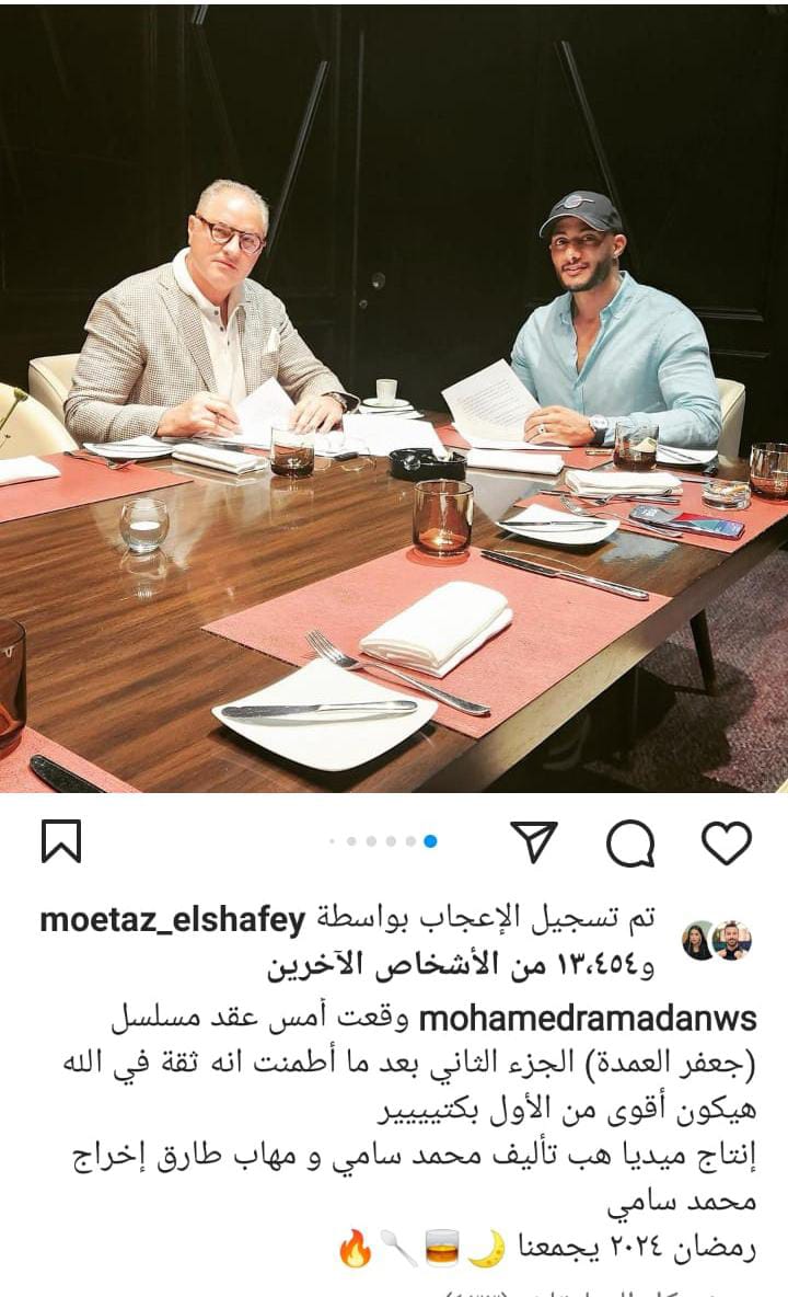 وشارك محمد رمضان، متابعيه عبر حسابه الرسمي بموقع إنستجرام، صورة له وهو يتعاقد على الجزء الثاني من مسلسل جعفر العمدة، وعلق عليها قائلًا: وقعت أمس عقد مسلسل جعفر العمدة الجزء الثاني، بعد أن اطمنت إنه ثقة في الله هيكون أقوى من الأول بكتير.