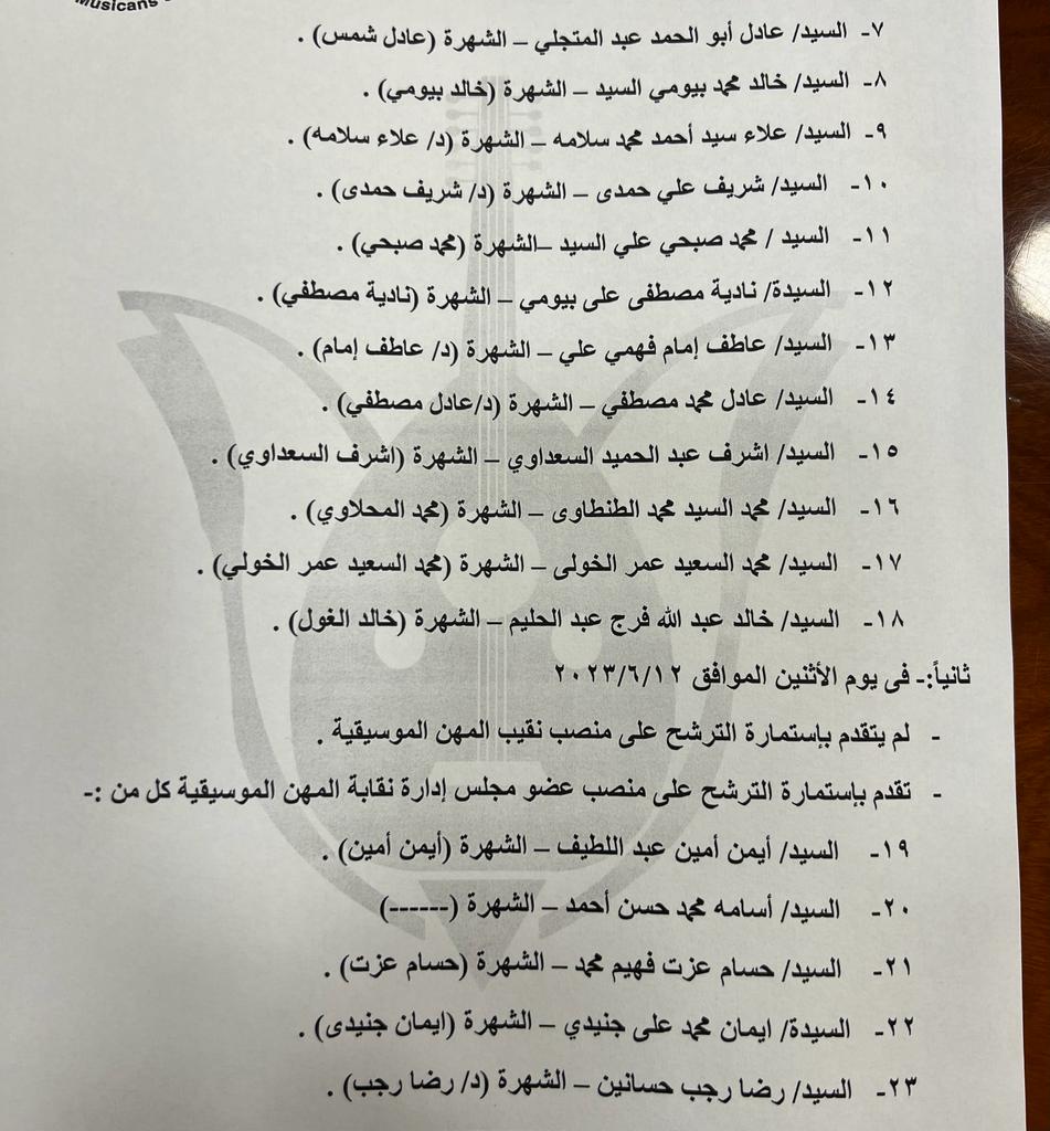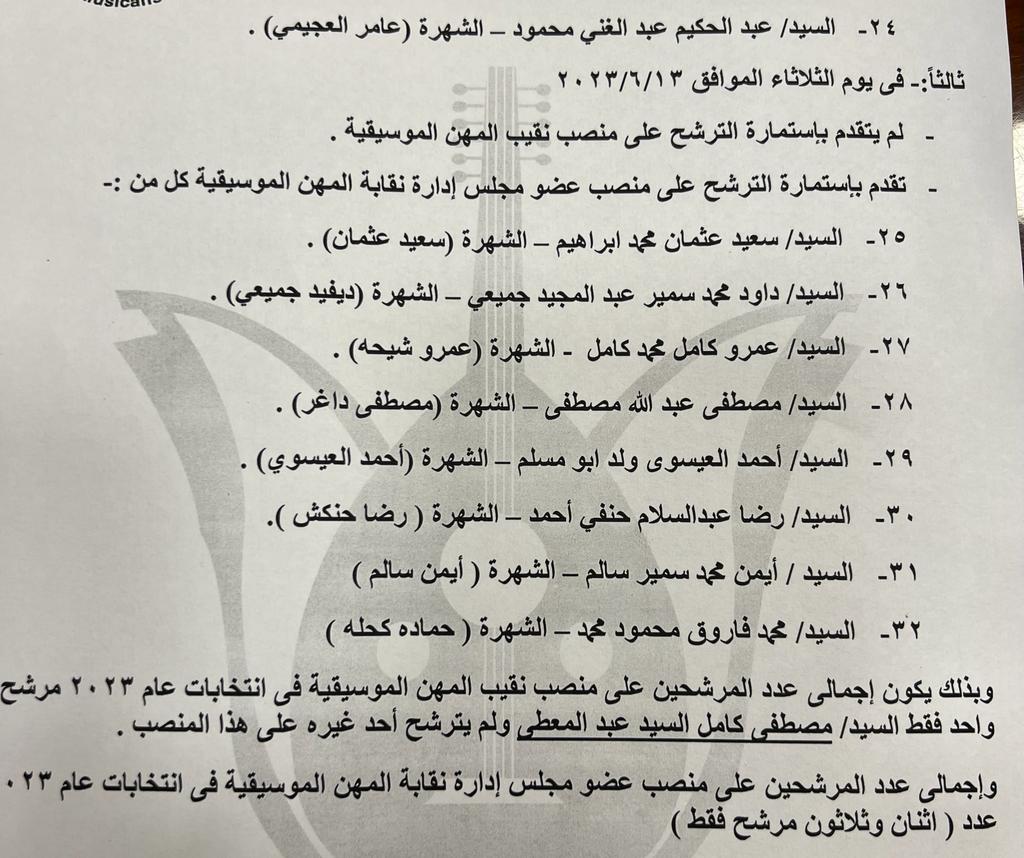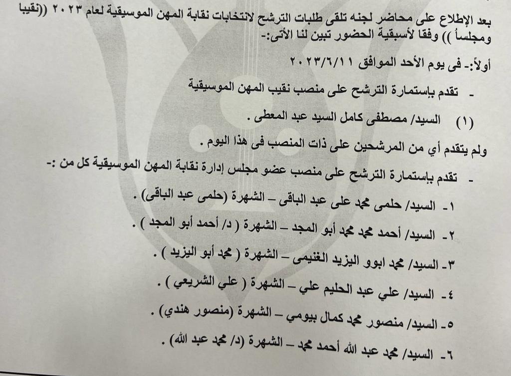 وبعد الاطلاع على محاضر لجنة تلقي طلبات الترشح لانتخابات المهن الموسيقية لعام 2023، تقدم الفنان مصطفى كامل بالترشح على منصب نقيب المهن الموسيقية يوم الأحد 11 يونيو الماضي، ولم يتقدم أي مرشح آخر على منصب النقيب يومي 12 و13 يونيو.
