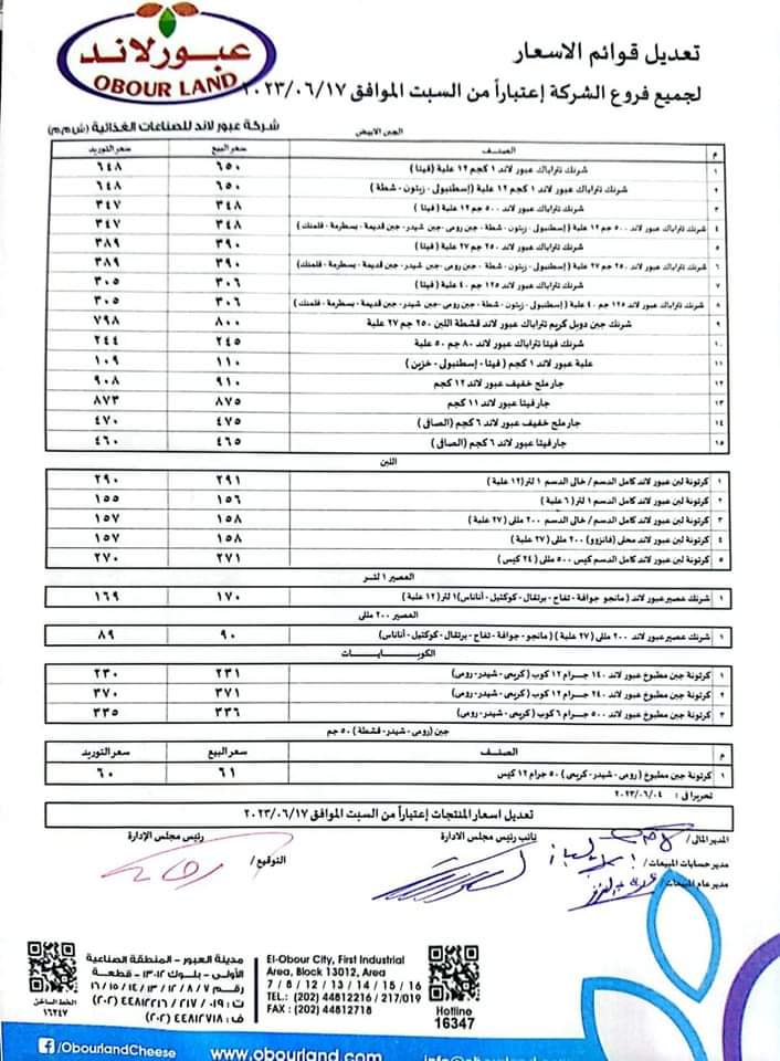 ورفعت الشركة أسعار عصير عبور لاند (مانجو – جوافة – برتقال – كوكتيل )، ا لتر إلى 170 جنيها للكرتونة التي تحمل 12 علبة، ورفعت أسعار كرتونة الجبنه المطبوخ 14 جرام إلى 231 جنيها للكرتونة 12 كوبا.