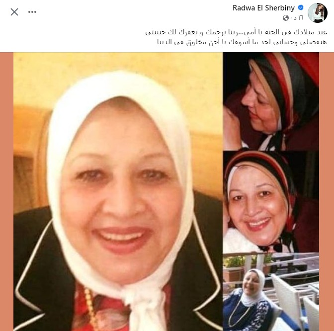 شاركت رضوى الشربيني، متابعيها مجموعة من الصور لوالدتها هالة أنور، عبر حسابها الشخصي بموقع التواصل الاجتماعي فيسبوك، وعلقت عليها قائلة: عيد ميلادك في الجنة يا أمي، ربنا يرحمك ويغفر لك حبيبتي، هتفضلي وحشاني لحد ما أشوفك يا أحن مخلوق في الدنيا.
