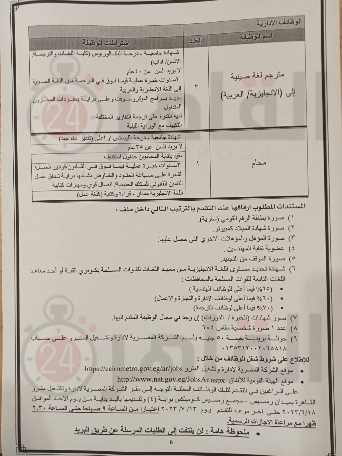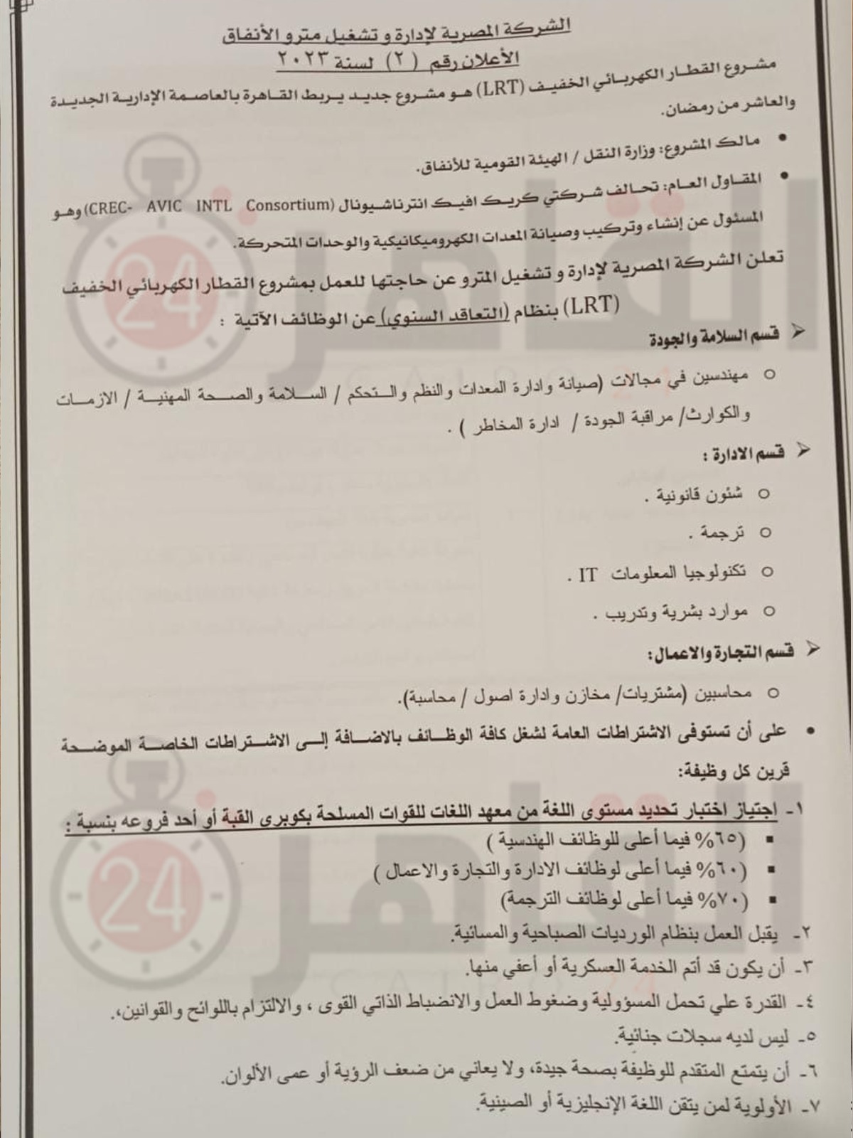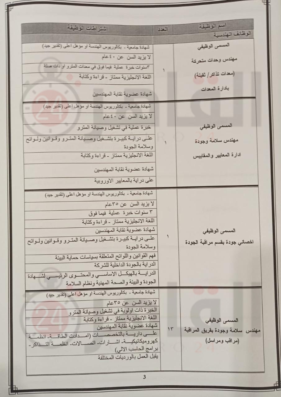 وحدد مسئولو مترو الأنفاق اشتراطات عامة لشغل الوظائف في مشروع القطار الكهربائي الخفيف LRT، والتي جاءت كالآتي:
