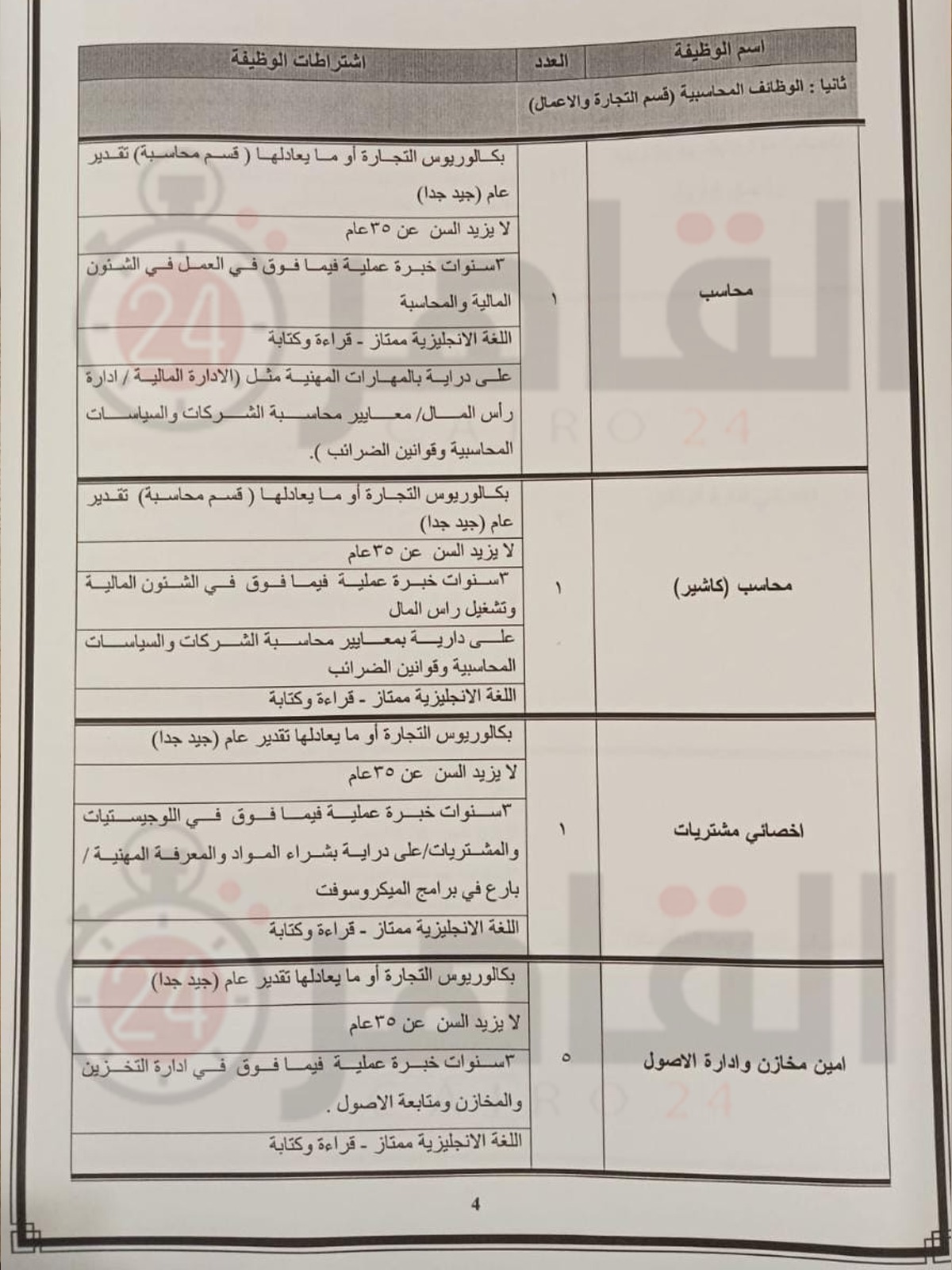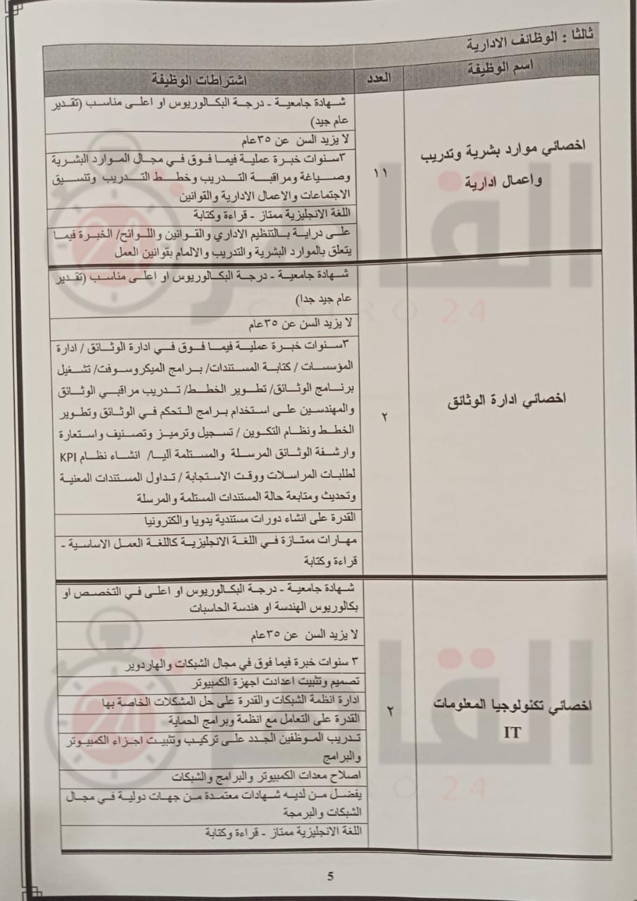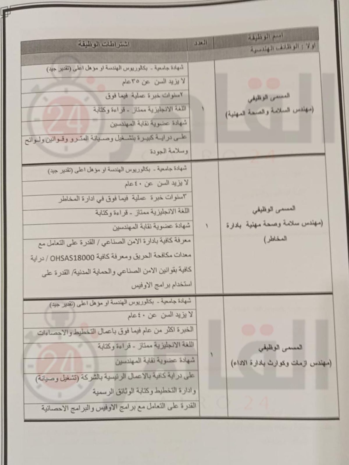وقالت مصادر لـ القاهرة 24، إن الوظائف المتاحة تكون في قسم السلامة والجودة، والتي تتضمن مهندسين في مجالات الصيانة وإدارة المعدات والنظم والتحكم، ومهندسين في مجال السلامة والصحة الهنية، ومهندسين في مجال الأزمات والكوارث، ومهندسين مراقبة الجودة، ومهندسين إدارة المخاطر.