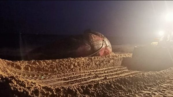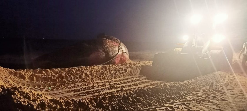 دفن الحوت النافق على شاطئ بورسعيد