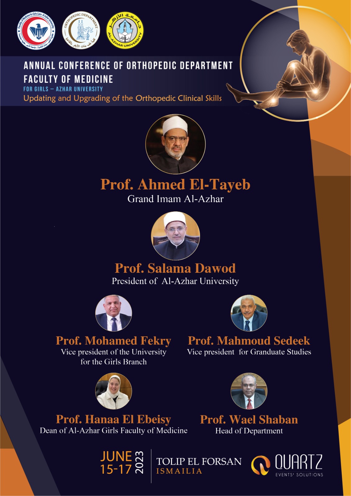 وأوضح الدكتور وائل شعبان أن المؤتمر السنوي لقسم العظام يقام بالتعاون مع جمعية مناظير المفاصل وإصابات الرياضة المصرية EGAA، برئاسة الدكتور عادل حامد أستاذ ورئيس قسم جراحة العظام بكلية طب بنات الأزهر بالقاهرة سابقا ورئيس مجلس إدارة الجمعية، وجمعية الحوض والفخذ، برئاسة الدكتور أحمد حسان رئيس مجلس الإدارة، مشيرا إلى أن المؤتمر يعقد برعاية كريمة من فضيلة الإمام الأكبر الدكتور أحمد الطيب شيخ الأزهر الشريف، وفضيلة الدكتور سلامة داود رئيس الجامعة، والدكتور محمود صديق نائب رئيس الجامعة للدراسات العليا والبحوث، المشرف العام على قطاع المستشفيات الجامعية بجامعة الأزهر، والدكتور محمد فكري خضر نائب رئيس الجامعة لفرع البنات، والدكتورة هناء عبد الحميد العبيسي عميدة كلية طب البنات جامعة الأزهر بالقاهرة.