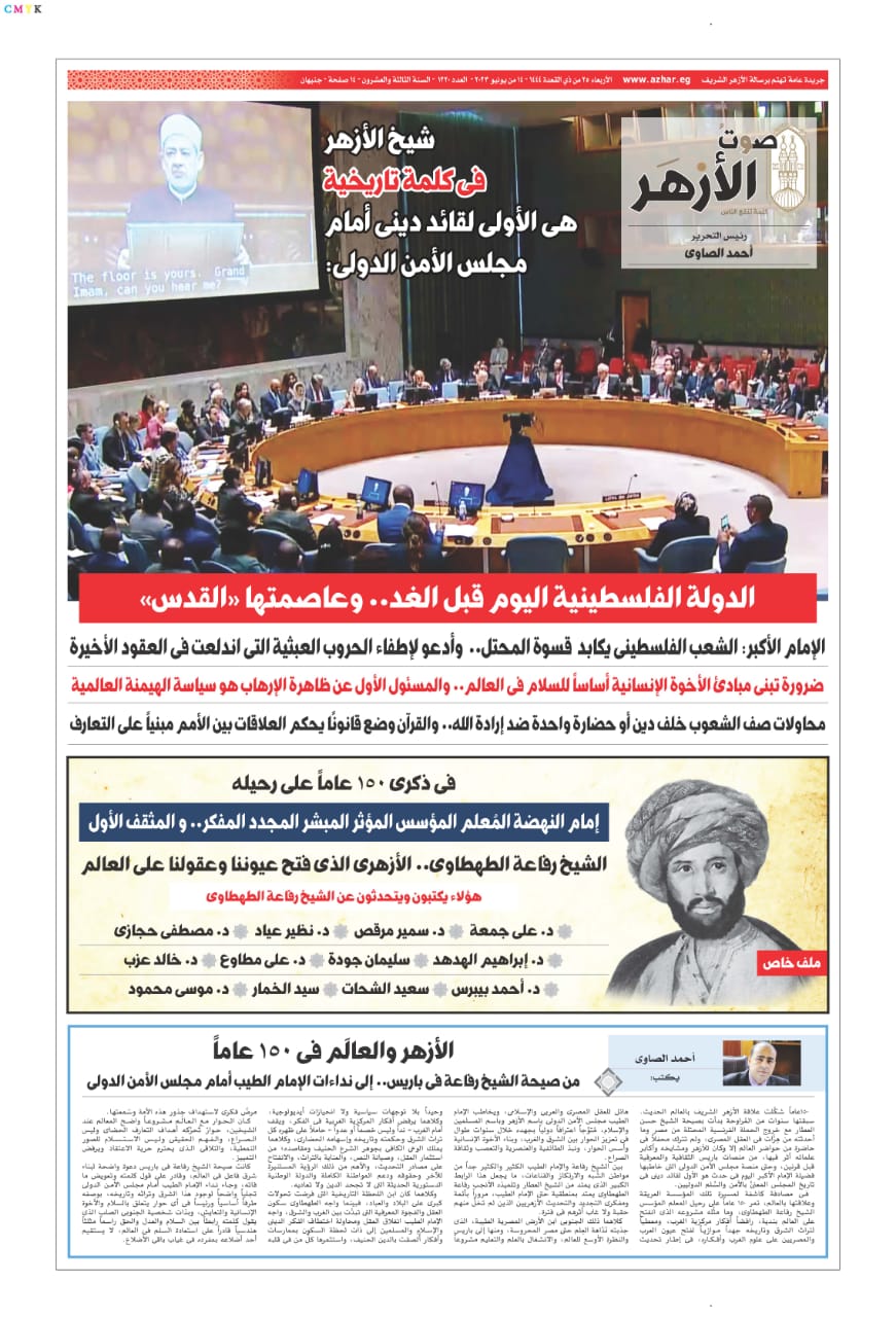 وفي نفس السياق، ركزت جريدة صوت الأزهر خلال عددها الجديد على الكلمة التاريخية للإمام الأكبر في مجلس الأمن، حيث جاءت المانشيت الرئيس لها: شيخ الأزهر في كلمة تاريخية هي الأولى لقائد ديني أمام مجلس الأمن الدولي: الدولة الفلسطينية اليوم قبل الغد.. وعاصمتها القدس.