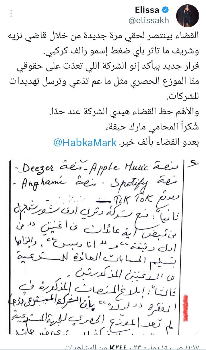وشاركت إليسا متابعيها، نص الحكم القضائي، عبر حسابها الشخصي بموقع تويتر، وعلقت عليها قائلة: القضاء بينتصر لحقي مرة جديدة، من خلال قاضي نزيه وشريف ما تأثر بأي ضغط، اسمو رالف كركبي، قرار جديد بيأكد إن الشركة التي تعدت على حقوقي منّا الموزع الحصري مثل ما عم تدعي، وترسل تهديدات للشركات.