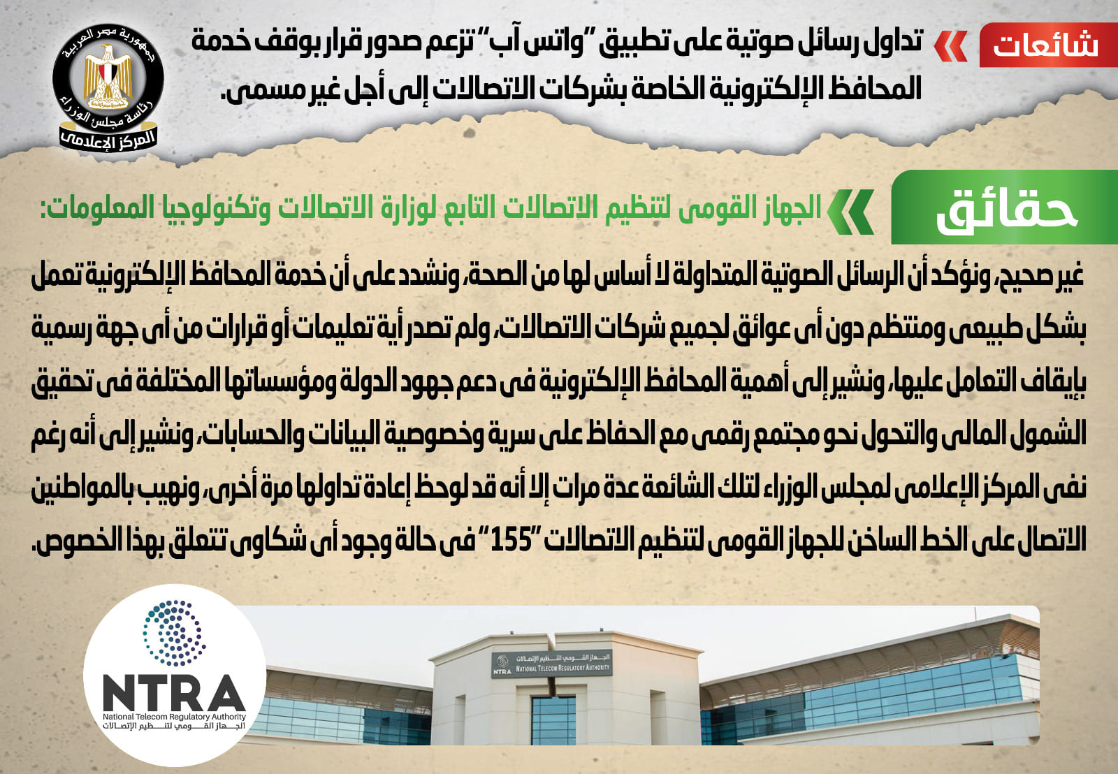 وفي هذا الصدد، تواصل المركز الإعلامي لمجلس الوزراء، مع الجهاز القومي لتنظيم الاتصالات التابع لوزارة الاتصالات وتكنولوجيا المعلومات، والذي نفى تلك الأنباء، مُؤكدًا أنه لا صحة لوقف خدمة المحافظ الإلكترونية الخاصة بشركات الاتصالات إلى أجل غير مسمى، وأن الرسائل الصوتية المتداولة لا أساس لها من الصحة.