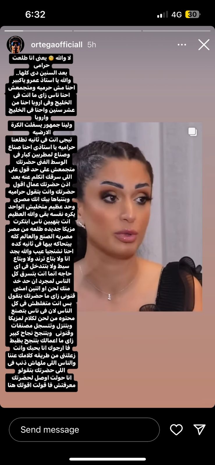 استكمل أورتيجا: عمال أقول حضرتك وأنت تقول حرامية وبنتباها بيك إنك مصري وحد عظيم متخليش الواحد يكره نفسه بقى والله العظيم، أنت بتهين ناس ابتكرت مزيكا، جديدة طالعة من مصر مصرية الصنع والعالم كله، بيتحاكه بيها في ثانية عيب والله بجد.