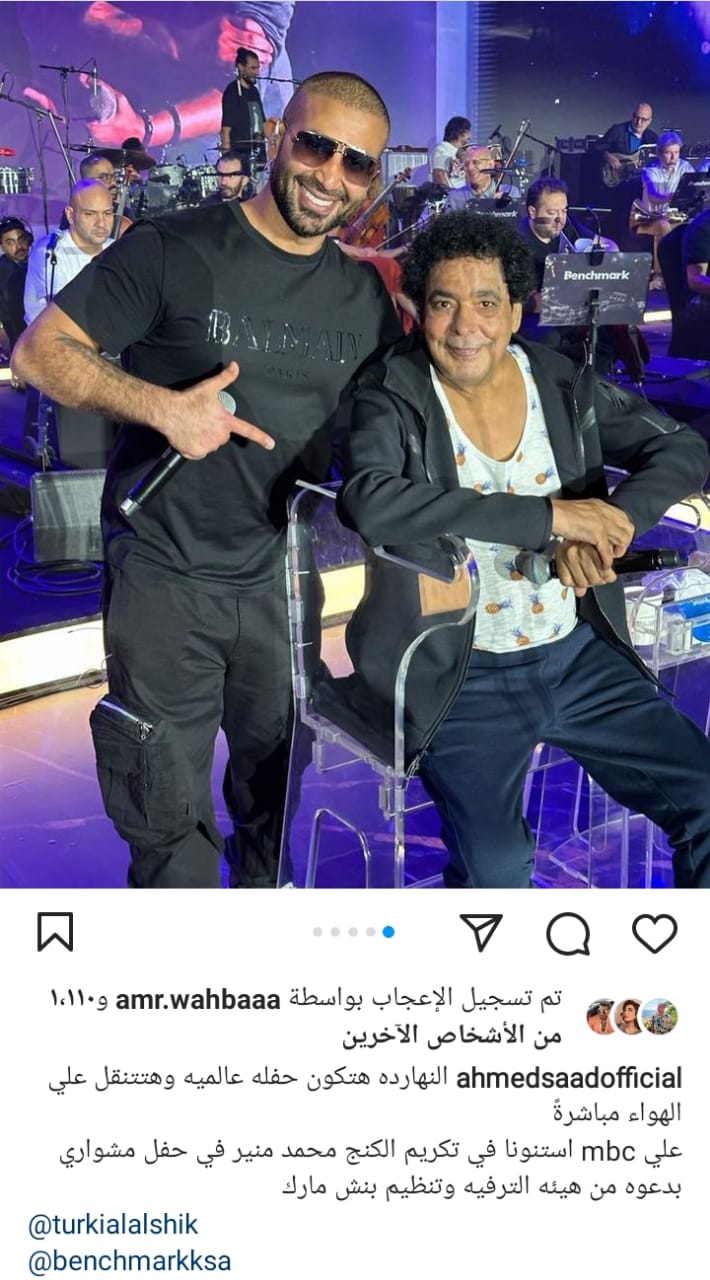 ونشر أحمد سعد الصور عبر حسابه الشخصي بموقع إنستجرام، وظهر برفقة الكينج محمد منير، وعلق عليها قائلًا: النهارده هتكون الحلفة عالمية وهتتنقل على الهواء مباشرة، على mbc، إستنونا في تكريم الكينج محمد منير حفل مشواري بدعوة من هيئة الترفيه وتنظيم بنش مارك.