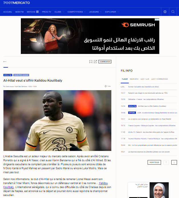 وفي الساق نفسه، نشرت شبكة فوت ميركاتوعبر موقعها الرسمي، أن نادي الهلال الذي حاول التعاقد مع ليونيل ميسي قبل انتقاله إلى نادي إنتر ميامي الأمريكي، يتجه الآن لمدافع مركزي واسمه كاليدو كوليبالي.
