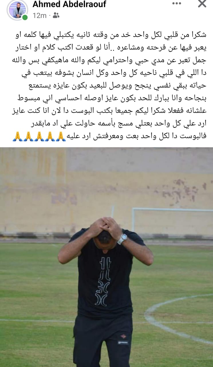 وكتب أحمد عبد الرؤوف مدرب بلدية المحلة قائلا: شكرا من قلبي لكل واحد خد من وقته ثانية يكتبلي فيها كلمة أو يعبر فيها عن فرحته ومشاعره.. أنا لو قعدت أكتب كلام أو أختار جمل تعبر عن مدى حبي واحترامي ليكم والله ماهيكفي بس والله دا اللي في قلبي ناحية كل واحد وكل إنسان بشوفه بيتعب في حياته ببقى نفسي ينجح ويوصل للبعيد بكون عايزه يستمتع بنجاحه، وأنا ببارك لحد بكون عايز أوصله إحساسي إني مبسوط علشانه.