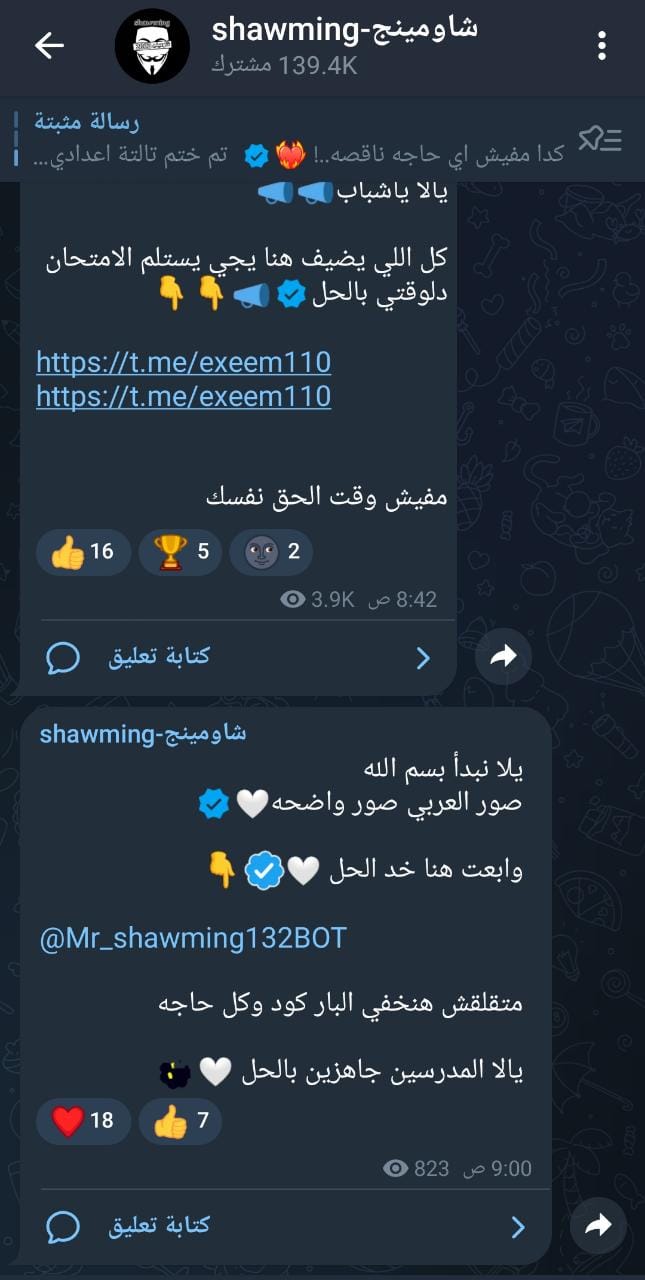 حرض أدمن جروب شاومينج للغش الإلكتروني، طلاب الثانوية العامة 2023، على التعاون معه وتصوير امتحان مادة اللغة العربية وإرساله لهم منذ بدء الامتحان بدقائق، لحله وإرساله للطلاب عبر جروبات الغش على تطبيق التليجرام.