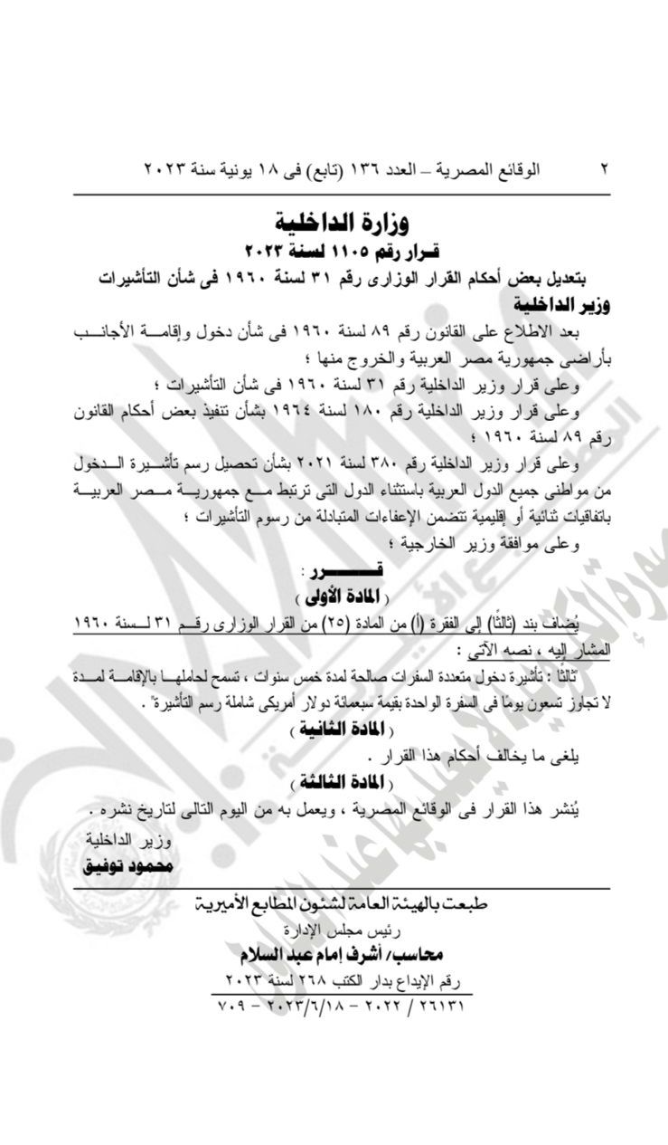 أصدرت وزارت الداخلية القرار رقم 1105 لسنة 2023 بتعديل بعض أحكام القرار الوزاري رقم 31 لسنة 1960 بشأن تحصيل رسم تأشيرة الدخول من مواطني جميع الدول العربية باستثناء الدول التي ترتبط مع جمهورية مصر العربية باتفاقيات ثنائية أو إقليمية تتضمن الإعفاءات المتبادلة من رسوم التأشيرات.