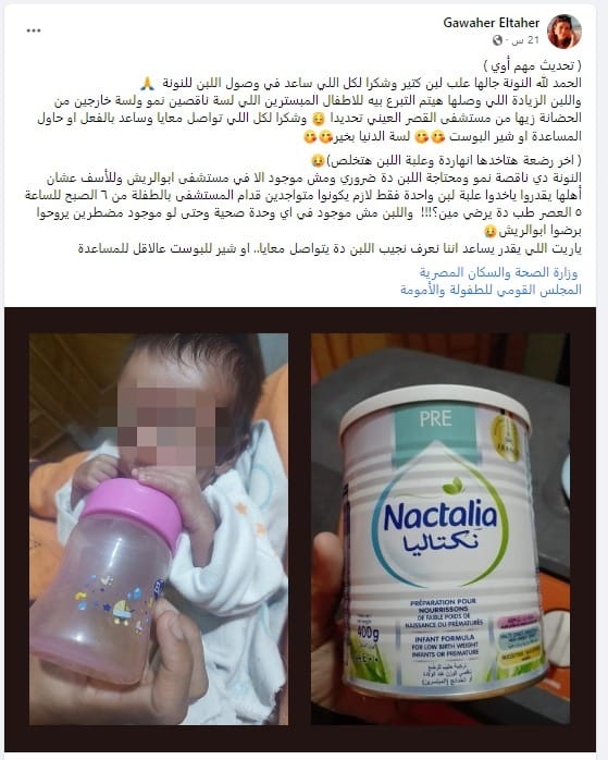 وكانت الحقوقية جواهر الطاهر الناشطة الحقوقية لدى مؤسسة قضايا المرأة المصرية، استغاثت من خلال منشور علي فيس بوك بالمسئولين بوزارة الصحة والسكان، والمجلس القومي للطفولة، من صعوبة وصول أهل طفلة لـ علبة لبن بمستشفى أبو الريش، قائلة: آخر رضعة هتاخدها النهاردة وعلبة اللبن هتخلص.