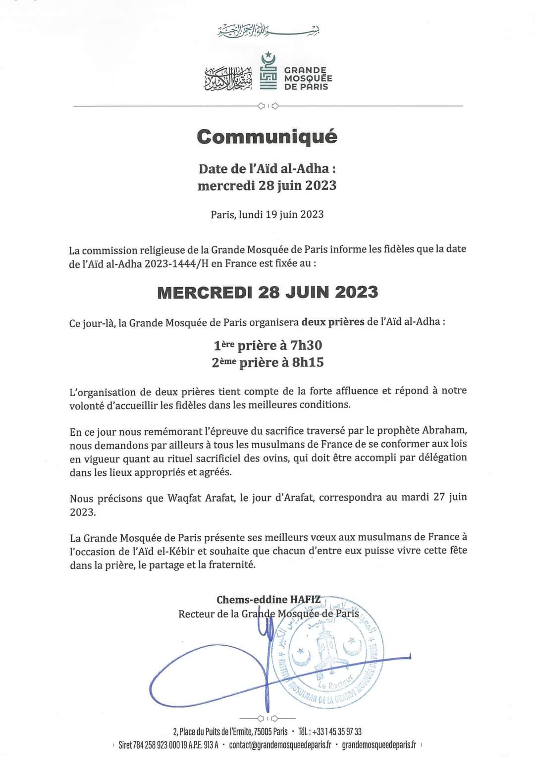 أصدر مسجد باريس الكبير بيانًا، أعلن فيه أن يوم الأربعاء 28 يونيو، هو أول أيام عيد الأضحى المبارك في فرنسا.