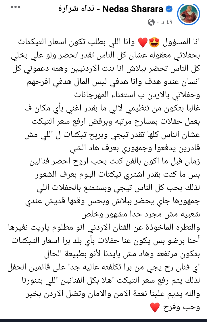 واستكملت نداء شرارة: لأنه بطبيعة الحال أي فنان رح ييجي من برا تكلفته عالية جدًا على القائمين على الحفل لذلك يتم رفع سعر التذاكر، أهلا بكل الفنانين اللي بتنورنا والله يديم علينا نعمة الأمن والأمان وتضل الأردن بخير وحب وفرح.