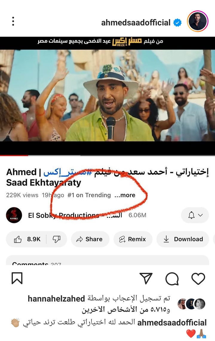 شارك أحمد سعد، متابعيه صورة عبر حسابه الشخصي بموقع انستجرام، ظهر من خلالها متصدر التريند رقم واحد عبر موقع الفيديوهات الشهير يتويوب، وعلق عليها قائلًا: الحمد الله اختياراتي طلعت تريند حياتي.
