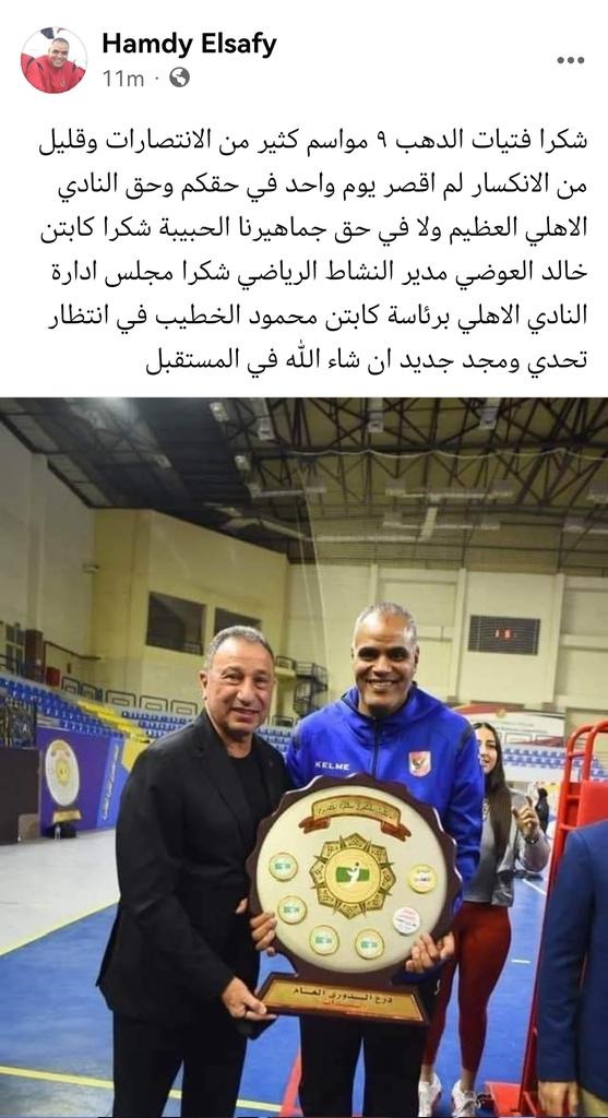 وقال حمدي الصافي في عبر حسابه الشخصي على موقع التواصل الاجتماعي فيسبوك: شكرًا فتيات الدهب 9 مواسم كثير من الانتصارات وقليل من الانكسار.