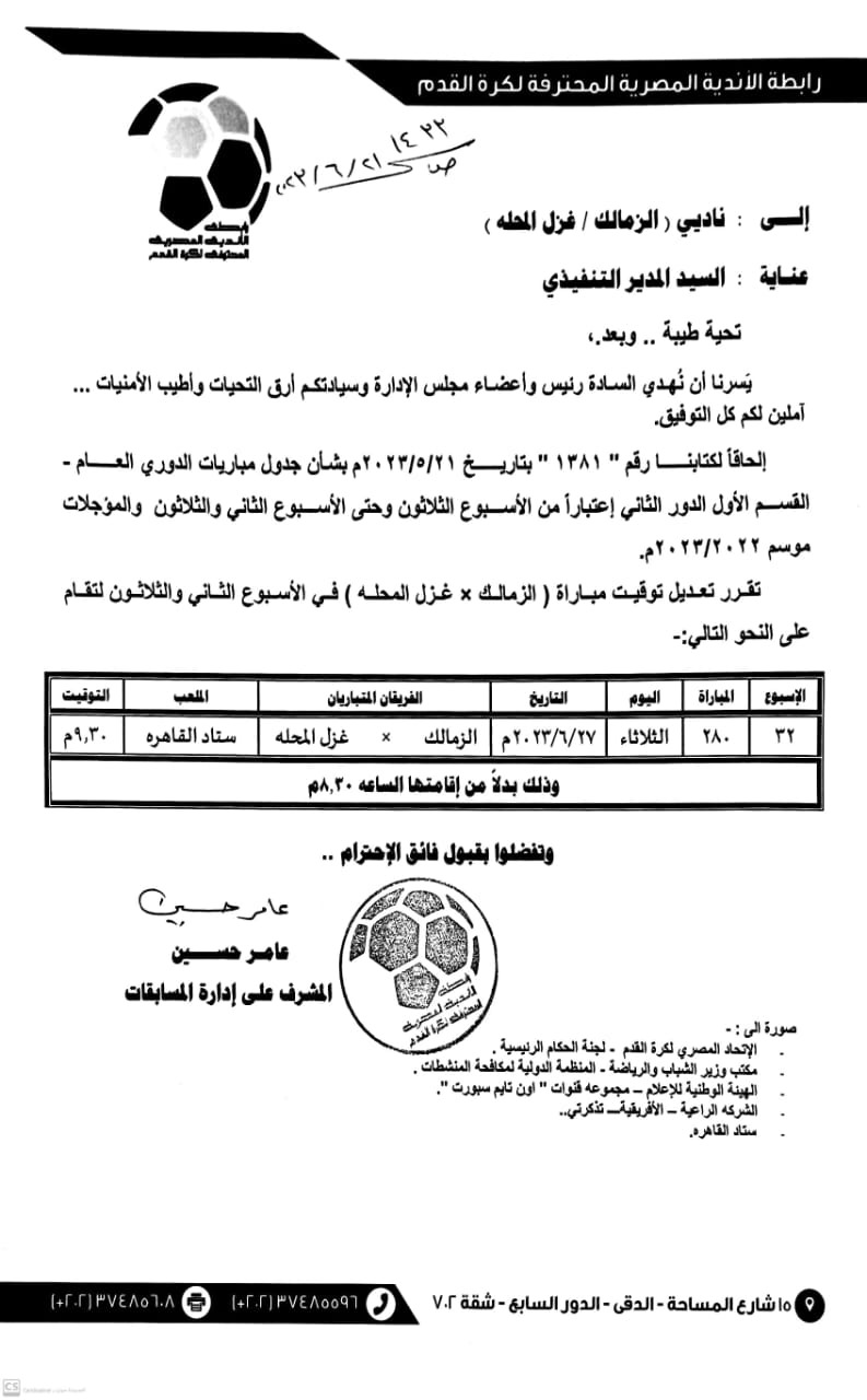 وأرسلت رابطة الأندية خطابًا رسميًا مساء اليوم إلى ناديي الزمالك وغزل المحلة، أخطرت كل منهما فيه بتأخير موعد انطلاق مباراة الفريقين المقررة يوم الثلاثاء المقبل، ليبدأ في التاسعة والنصف مساءً بدلًا من الثامنة والنصف مساء اليوم ذاته.