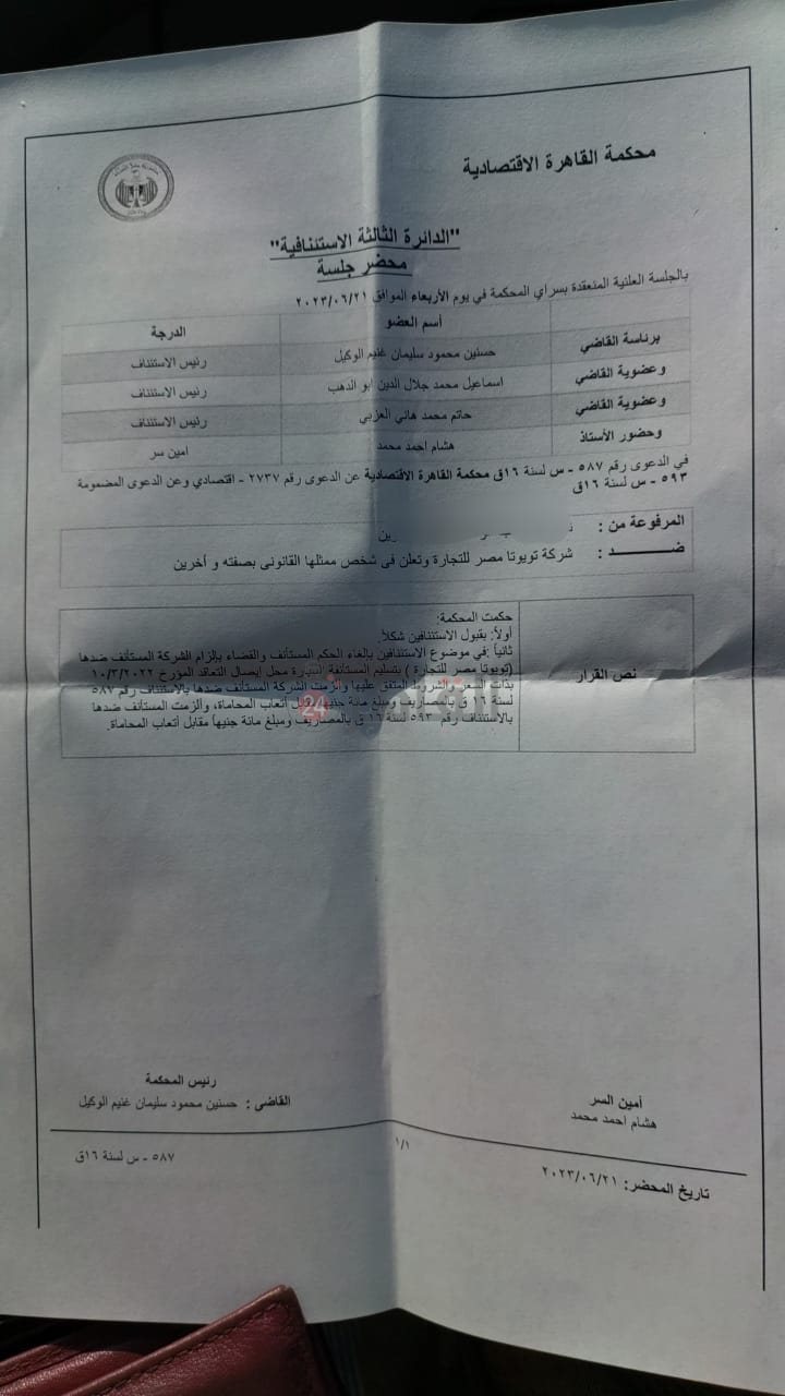 حكم نهائي يُلزم تويوتا مصر بتسليم سيارة كورولا لإحدى الحاجزات بالسعر القديم | مستند