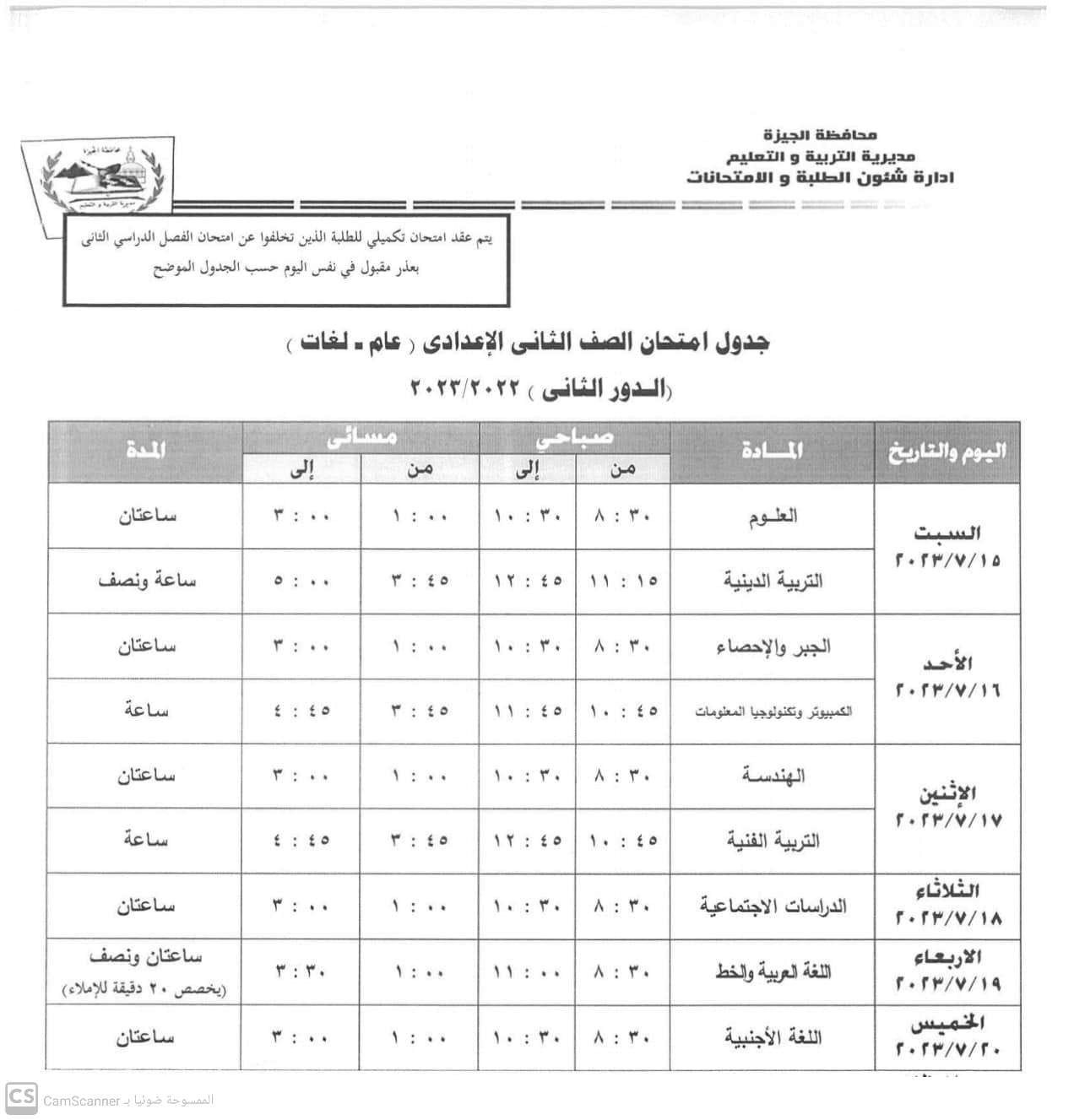 - الصف الثاني الإعدادي ( عام – فصل واحد – مكفوفين- مهني ) خلال الفترة من السبت 15 يوليو حتى يوم الخميس 20 يوليو 2023