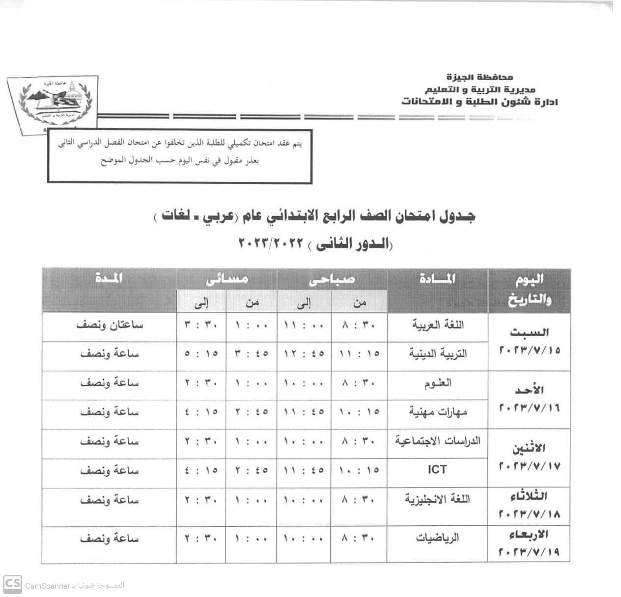 - الصف الرابع الابتدائى ( عام – فصل واحد – مكفوفين ) يبدأ من يوم السبت 15 يوليو حتى يوم الأربعاء 19 يوليو 2023.