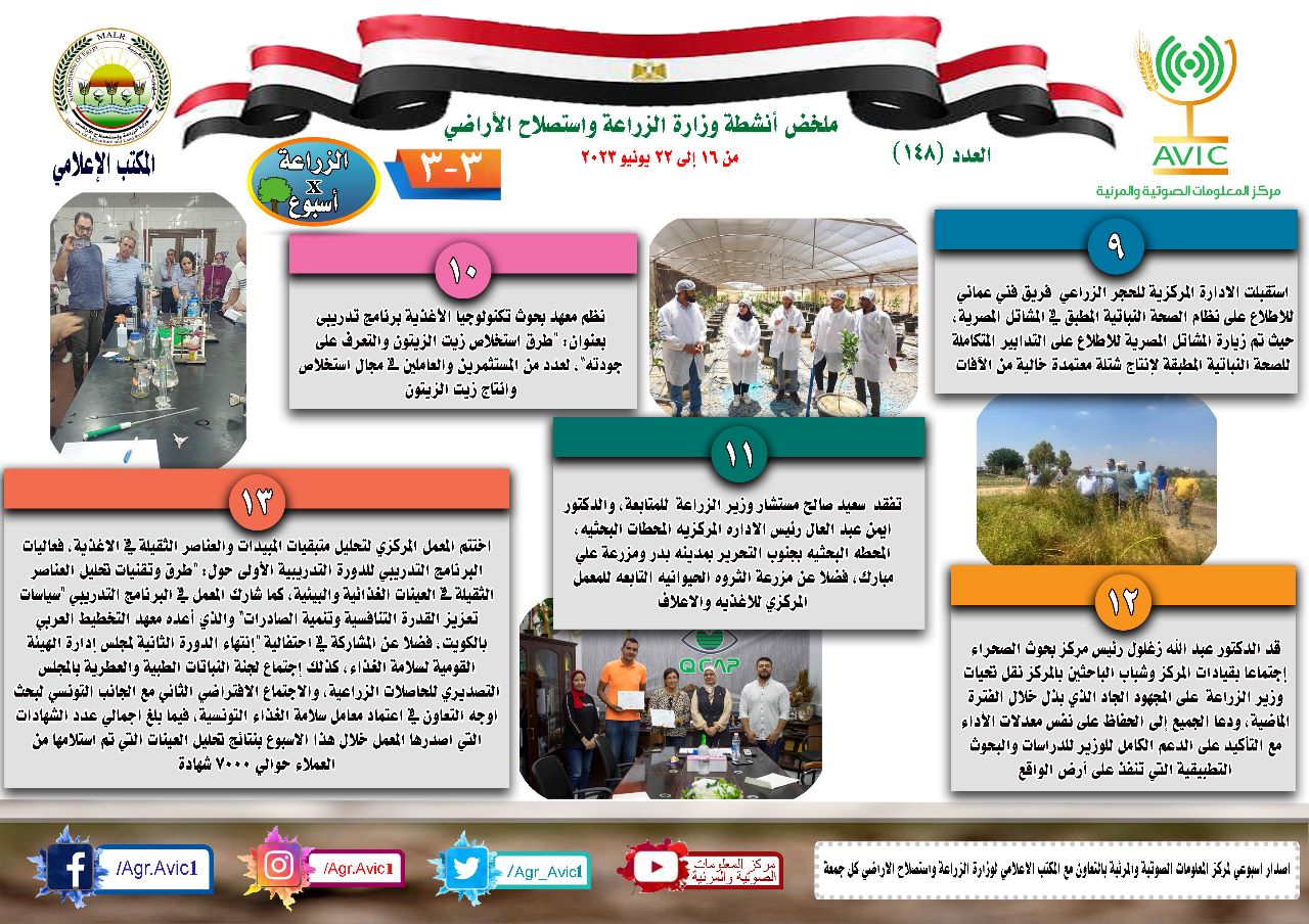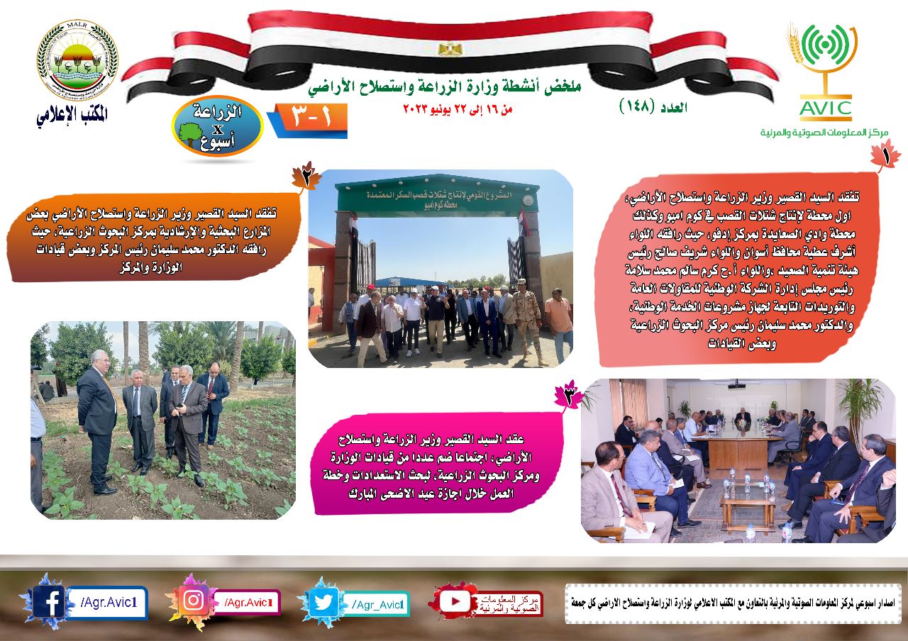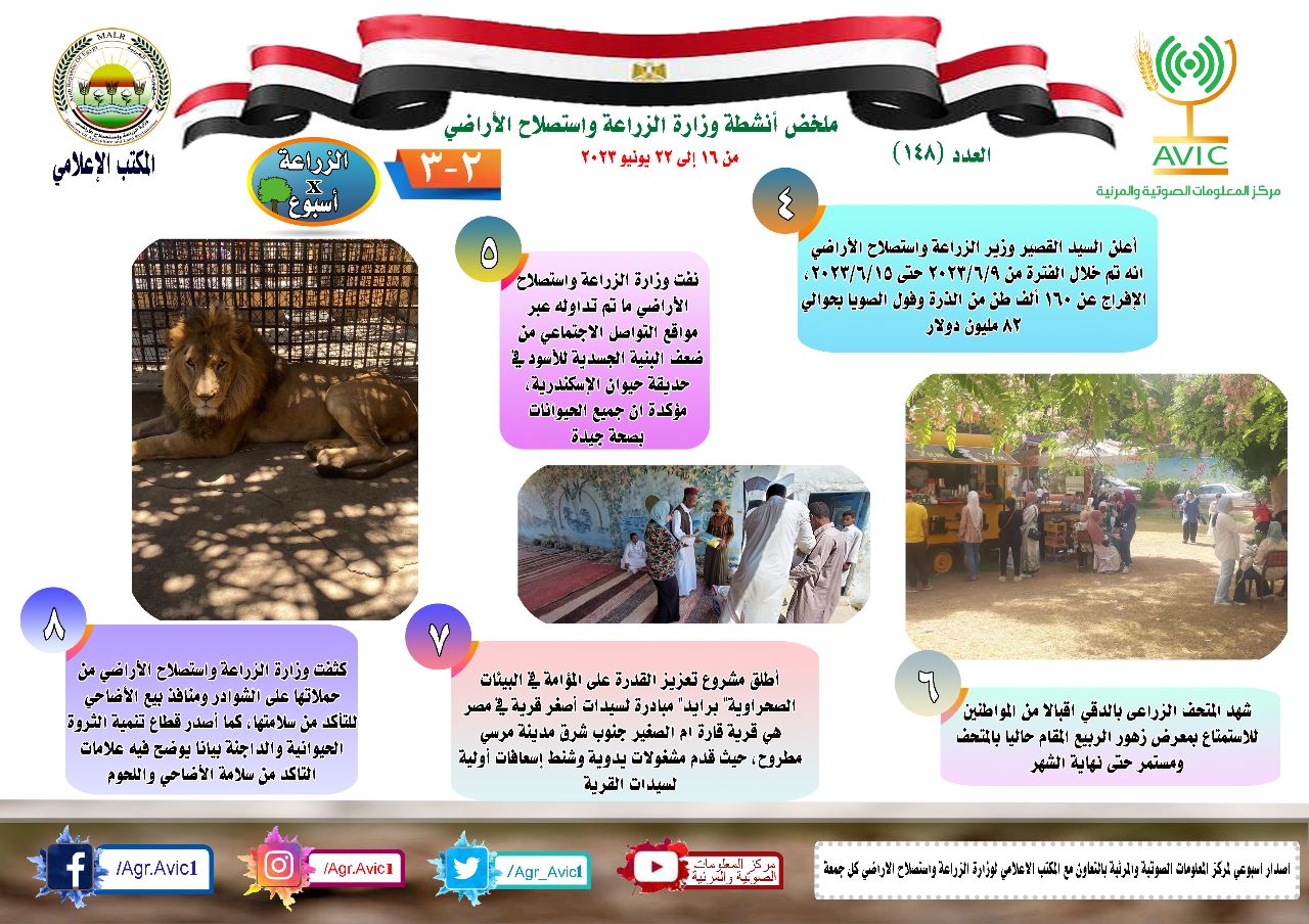 أصدر مركز المعلومات الصوتية والمرئية، التابع لوزارة الزراعة واستصلاح الأراضي، الانفوجراف الأسبوعي، في نسخته رقم 148، حول الحصاد الأسبوعي لأهم أنشطة الوزارة، خلال الأسبوع الماضي خلال الفترة من 16 وحتى 22 يونيو الجاري، وذلك بالتعاون مع المكتب الإعلامي للوزارة.