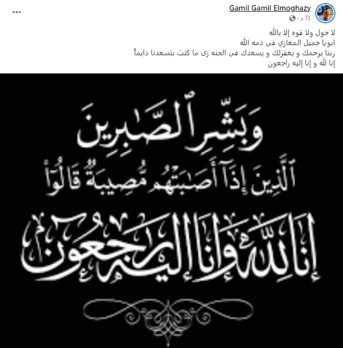 وكتب جميل جميل المغازي عبر حسابه على فيسبوك منذ قليل: لا حول ولا قوة إلا بالله.. أبويا جميل المغازي في ذمة الله.. ربنا يرحمك ويغفر لك ويسعدك في الجنة زي ما كنت بتسعدنا دايمًا.. إنا لله وإنا إليه راجعون.