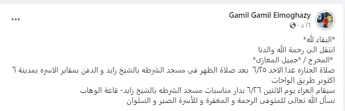 وكان أعلن جميل جميل المغازي، وفاة والده، صباح اليوم، وكتب منشور عبر صفحته بموقع فيس بوك، وقال: لا حول ولا قوة إلا بالله.. أبويا جميل المغازي في ذمة الله.. ربنا يرحمك ويغفر لك ويسعدك في الجنة زي ما كنت بتسعدنا دايمًا.. إنا لله وإنا إليه راجعون.