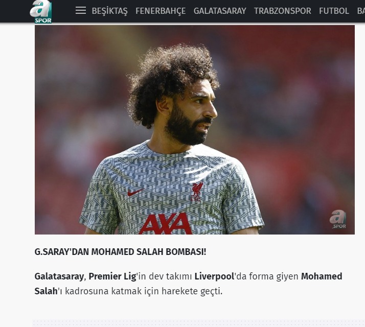 كشفت قناة A Spor التركية، عن مفاجأة من العيار الثقيل، بشأن مستقبل محمد صلاح قائد منتخب مصر الوطني المحترف ضمن صفوف فريق ليفربول الإنجليزي.