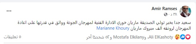 وكتب أمير رمسيس، منشورا عبر صفحته بموقع فيس بوك، قائلا: سعيد جدا بخبر تولي الصديقة ماريان خوري، الإدارة الفنية لمهرجان الجونة، وواثق في قدرتها على إعادة المهرجان لرونقه، ألف مبروك ماريان.