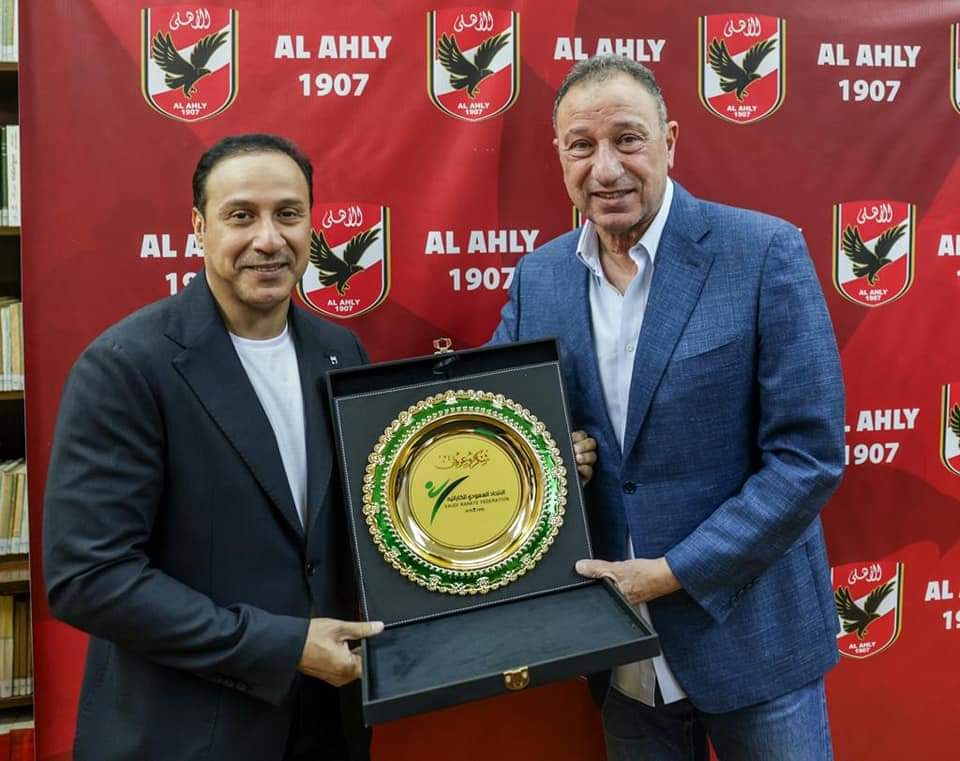 وقام الكابتن الخطيب بإهداء درع وعلم وتيشيرت الأهلي إلى رئيس الاتحاد السعودي للكاراتيه، فيما قام الضيف بإهداء الكابتن محمود الخطيب درع الاتحاد السعودي للكاراتيه.