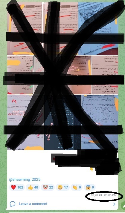 وفي التاسعة صباحًا، انطلقت الامتحانات داخل اللجان، ونشر جروب شاومينج السري بعد مرور 14 دقيقة تقريبًا، عددًا من الصور زعم أنها خاصة بامتحان الكيمياء، ورغم مرور نصف ساعة على بدء اللجان، إلا أنه لم يتم نشر أي أجزاء من امتحان الجغرافيا الذي زعم أنه نجح في تسريبه.