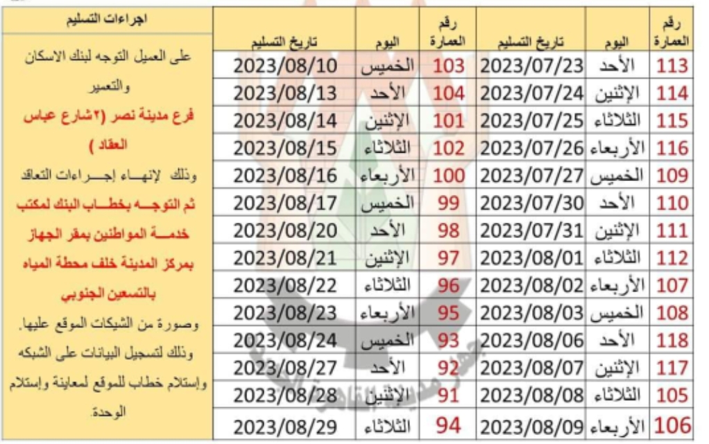 وأوضح الجهاز في بيان له اليوم، أن أعمال التسليم تبدأ يوم الأحد الموافق 2023/7/23، بمسلسل رقم 3-4-5 المرحلة الأولى، ومسلسل رقم 2.