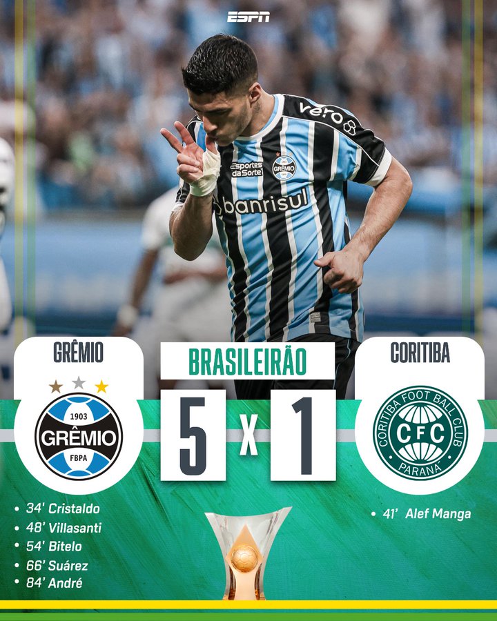سواريز يشارك ويسجل في خماسية جريمو ضد كوريتيبا في الدوري البرازيلي