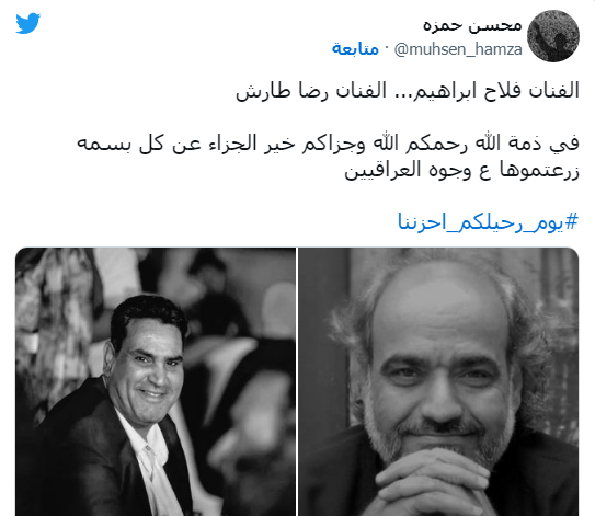 وفي سياق آخر، توفى الفنان العراقي فلاح إبراهيم أول أمس، ونعت النقابة الراحل، وذلك جاء بيانًا عبر حسابها الرسمي بـ فيس بوك جاء فيه: ببالغ الحزن والأسى تنعى نقابة الفنانين العراقيين رحيل الفنان فلاح إبراهيم، والذي وافته المنية هذا اليوم، سائلين المولى أن يتغمده بواسع رحمته، وأن يلهم ذويه ومحبيه وزملائه الصبر والسلوان، وإنا لله وإنا إليه راجعون.