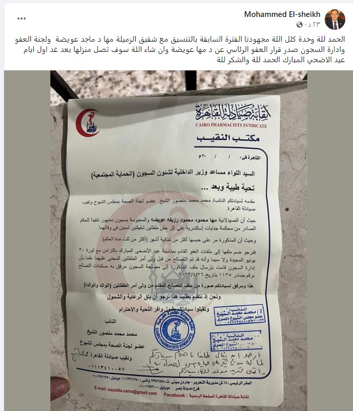 وأوضح الدكتور محمد الشيخ، في منشور له على صحفته الشخصية بمواقع التواصل الاجتماعي، أنه تم التواصل مع لجنة العفو وإدارة السجون بالتنسيق مع شقيق الصيدلانية، لضمها إلى ملفات العفو الرئاسي المقبلة بمناسبة عيد الأضحى المبارك.