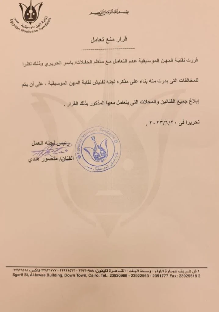 وجاء بيان نقابة المهن الموسيقية كالتالي: قررت نقابة المهن الموسيقية عدم التعامل مع منظم الحفلات ياسر الحريري، وذلك نظرًا للمخالفات التي بدرت منه على مذكرة لجنة تفتيش نقابة المهن الموسيقية، على أن يتم إبلاغ جميع القائمين والمحلات التي يتعامل معها المذكور بذلك القرار.