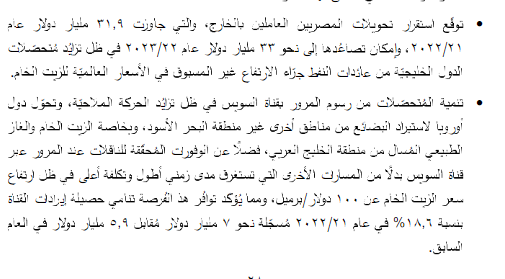 وكشفت الخطة عن توقعات بتنمية المتحصلات من رسوم المرور بقناة السويس في ظل تزايد الحركة الملاحية، وتحول دول أوروبا لاستيراد البضائع من مناطق أخرى غير منطقة البحر الأسود، وبخاصة الزيت الخام والغاز الطبيعي المسال من منطقة الخليج العربي خلال العام الجديد، فضلا عن الوفورات المحققة للناقلات عند المرور عبر قناة السويس بدلا من المسارات الأخرى التي تستغرق مدى زمني أطول وتكلفة أعلى في ظل ارتفاع سعر الزيت الخام عن 100 دولار / برميل.