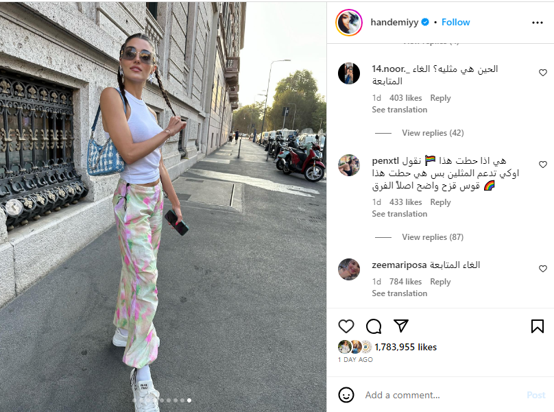 ونشرت هاندا أرتشيل صورًا عديدة لها عبر حسابها على إنستجرام، وعلقت قائلة: أريد شيئًا فقط مثل هذا، مشيرة إلى علم الريمبو الذي يعبر عن المثليين.