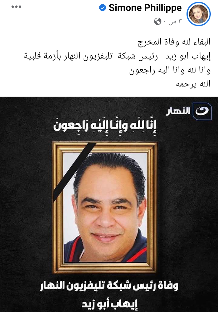 كتبت سيمون قائلة: البقاء لله وفاة المخرج إيهاب أبو زيد، رئيس شبكة تلفزيون النهار، بأزمة قلبية، إنا لله وأنا إليه راجعون، الله يرحمه.