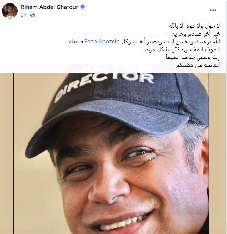 ومن جانبها، أعربت الفنانة ريهام عبد الغفور عن بالغ حزنها لرحيل إيهاب أبو زيد، وكتبت منشورا عبر حسابها الشخصي بموقع فيسبوك، قائلة: لا حول ولا قوة إلا بالله، خبر آخر صادم وحزين.