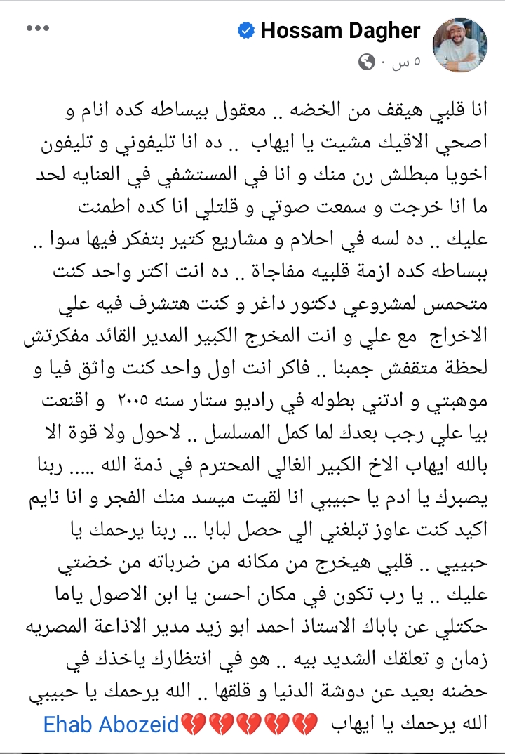 وكتب الفنان حسام داغر، عبر حسابه الشخصي عبر موقع فيسبوك: أنا قلبي هيقف من الخضة، معقول ببساطه كده أنام واصحي الاقيك مشيت يا إيهاب.