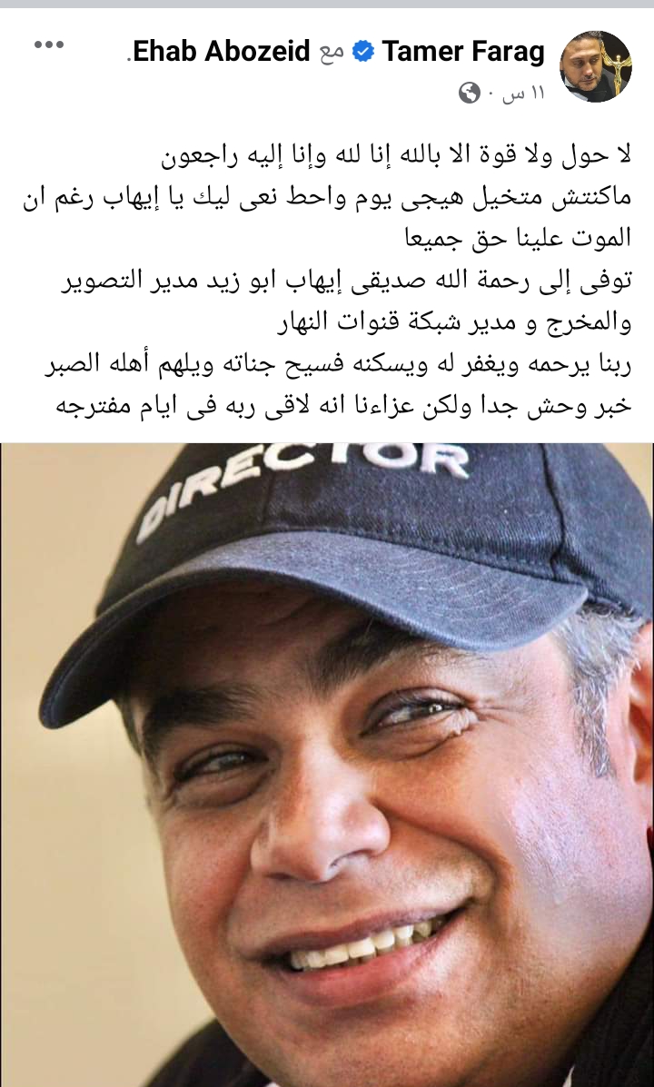 حرص العديد من الفنانين، على نعي المخرج إيهاب أبو زيد، رئيس شبكة قنوات النهار، الذي رحل عن عالمنا مساء أمس الخميس إثر تعرضه لأزمة قلبية.